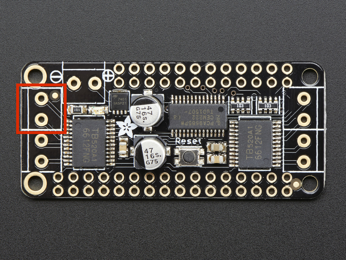 ~adafruit_motor.motor.DCMotorcontrols for motor 2.The following image shows the location of the M2 terminal on the DC/Stepper FeatherWing. The label on the FeatherWing is found on the bottom of the board. The terminal is labeled on the top of the Shield and Pi Hat.